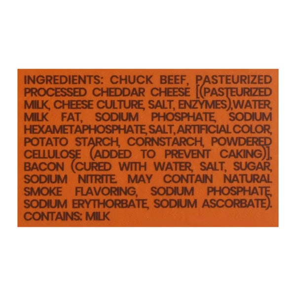 Usda Beef Chuck, Cheddar Cheese [(pasteurized Milk, Cheese Culture, Salt, Enzymes), Water, Milk Fat, Sodium Phosphate, Sodium Hexametaphosphate, Salt, Artificial Color, Potato Starch, Corn Starch, Powdered Cellulose (added To Prevent Caking)], Bacon (cured With Water, Salt, Sugar, Sodium Nitrite. May Contain Natural Smoke Flavoring, Sodium Phosphate, Sodium Erythorbate, Sodium Ascorbate)