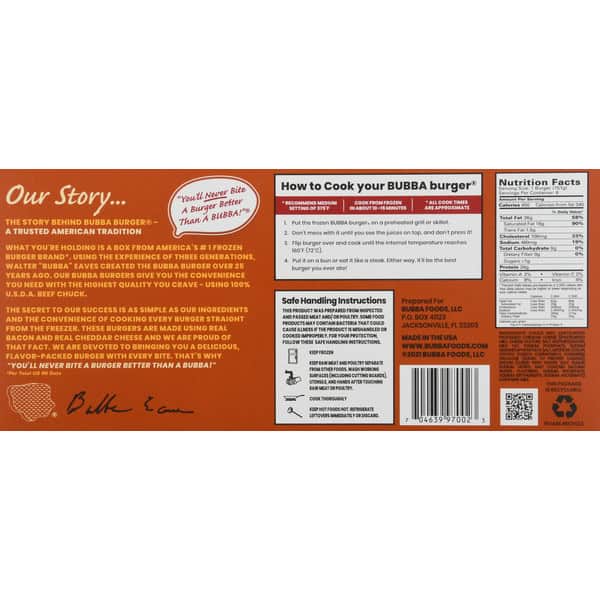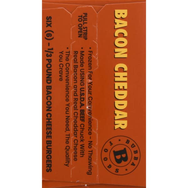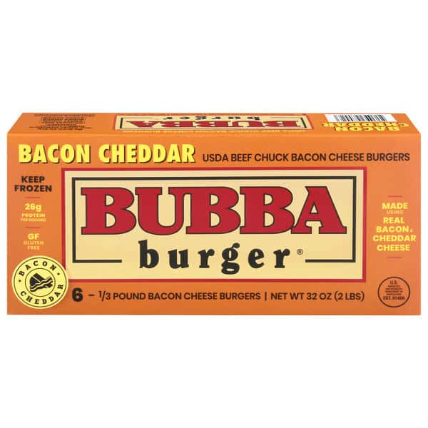 ? We make the Bacon Cheddar BUBBA burger® using only 100% USDA beef chuck, then we mix in real bacon and cheddar to make it even juicier and more delicious. This gives you an all-beef burger that’s high in protein and gluten free, with has no fillers, no additives, no preservatives and no added sodium — just the delicious, high-quality Angus beef you and your family crave. Since they’re frozen for your convenience, BUBBA burgers can go right from the freezer to the grill or the skillet and to your plate in about 10 minutes — no thawing needed — which makes them the perfect choice for cookouts, get-togethers or family meals any time you want a juicy and delicious burger.