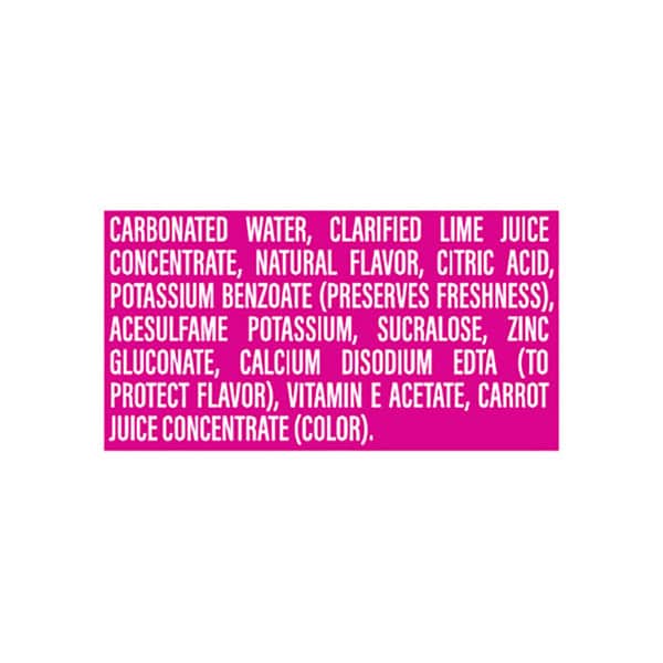 Carbonated Water, Clarified Lime Juice Concentrate, Natural Flavor, Citric Acid, Potassium Benzoate (preserves Freshness), Acesulfame Potassium, Sucralose, Zinc Gluconate, Calcium Disodium Edta (to Protect Flavor), Vitamin E Acetate, Carrot Juice Concentrate (color)