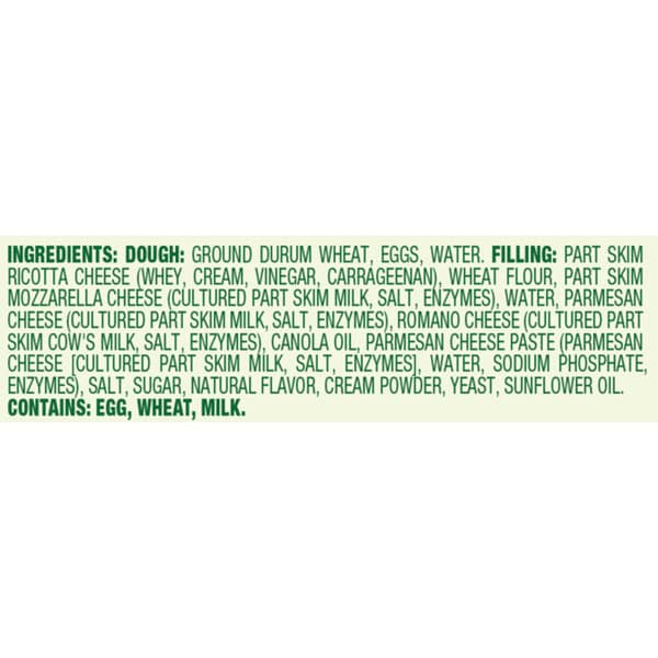 Dough: Ground Durum Wheat, Eggs, Water. Filling: Romano Cheese Made From Cow’s Milk (cultured Milk, Salt, Enzymes), Wheat Flour, Water, Canola Oil, Low-moisture Part-skim Mozzarella Cheese (cultured Part-skim Milk, Salt, Enzymes), Ricotta Cheese (whey, Milk, Cream, Vinegar, Salt), Parmesan Cheese (cultured Milk, Salt, Enzymes), Enzyme Modified Cheddar Cheese Paste (cheddar Cheese [cultured Milk, Salt, Enzymes], Water, Salt, Butter [cream, Salt], Enzymes), Salt, Onion Powder, Yeast, Cream Powder, Sugar, Spice, Natural Flavor, Sunflower Oil.