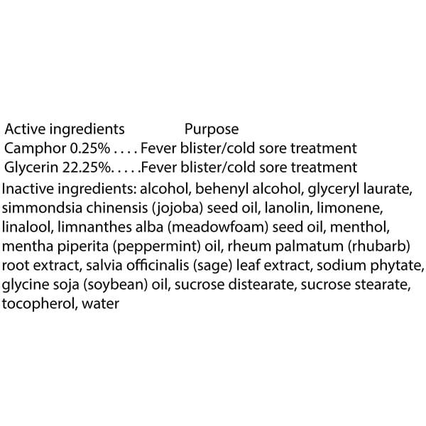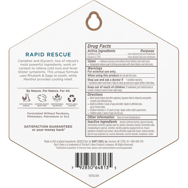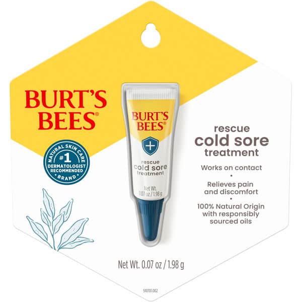 • COLD SORE TREATMENT: One 0.07 oz. tube of Burt’s Bees Rescue Cold Sore Treatment with Camphor and Glycerin to relieve cold sore and fever blister symptoms