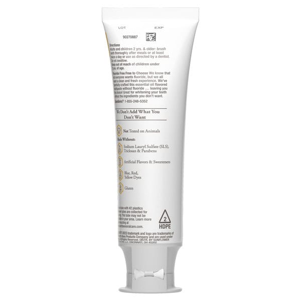 This Burt’s Bees fluoride free toothpaste is crafted to leave your breath fresh, and your mouth feeling clean. Experience the refreshment of Zen Peppermint toothpaste which will leave you clean and fresh! This toothpaste is crafted to help remove surface stains to help you achieve a beautiful smile! Not tested on animals and made without: Sodium Lauryl Sulfate (SLS free), Triclosan & Parabens, Artificial Flavors & Sweeteners, Preservatives & Blue, Red, Yellow Dyes and Plastic Microbeads.