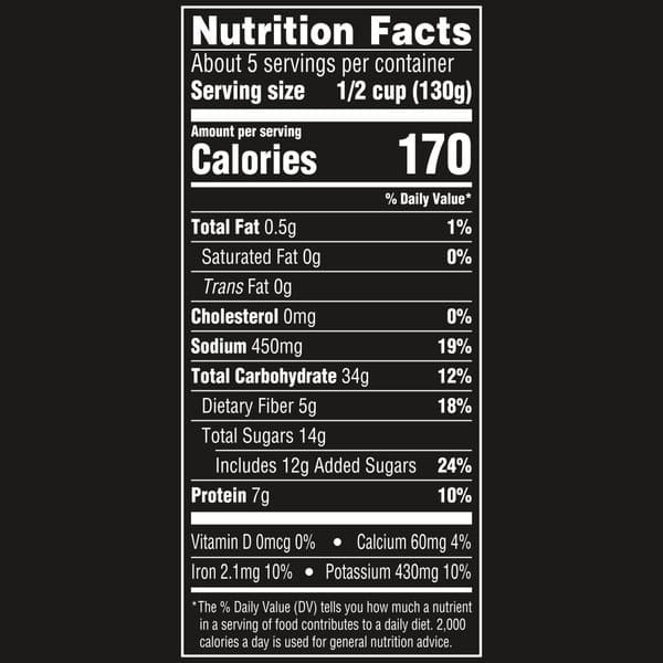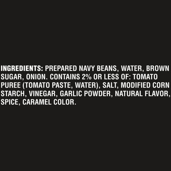 Prepared Navy Beans, Water, Brown Sugar, Onion. Contains 2% Or Less Of: Tomato Puree (tomato Paste, Water), Salt, Modified Corn Starch, Vinegar, Garlic Powder, Natural Flavor, Spice, Caramel Color.