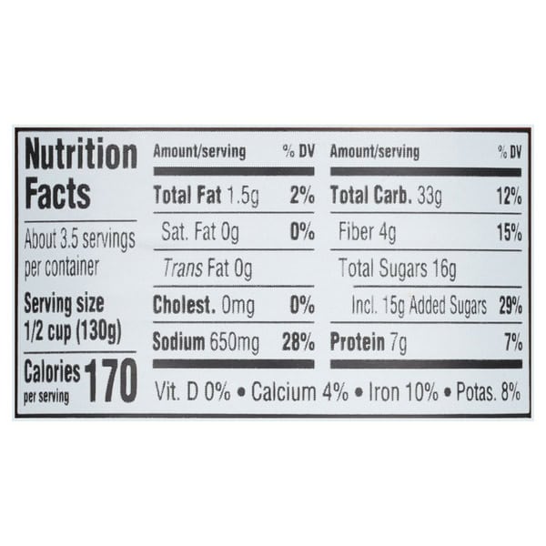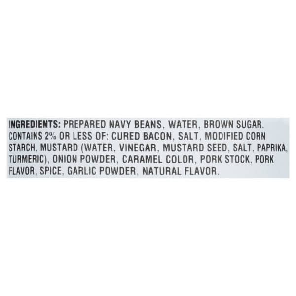 Prepared Navy Beans, Water, Brown Sugar, Contains 2% Or Less Of: Cured Bacon, Salt, Modified Corn Starch, Mustard (water, Vinegar, Mustard Seed, Salt, Paprika, Turmeric), Onion Powder, Caramel Color, Pork Stock, Pork Flavor, Spice, Garlic Powder, Natural Flavor