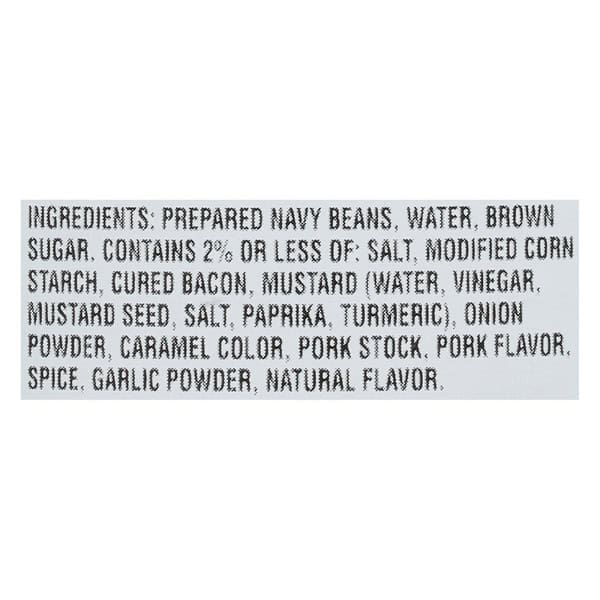 Prepared Navy Beans, Water, Brown Sugar, Contains 2% Or Less Of: Salt, Modified Corn Starch, Cured Bacon, Mustard (water, Vinegar, Mustard Seed, Salt, Paprika, Turmeric), Onion Powder, Caramel Color, Pork Stock, Pork Flavor, Spice, Garlic Powder, Natural Flavor