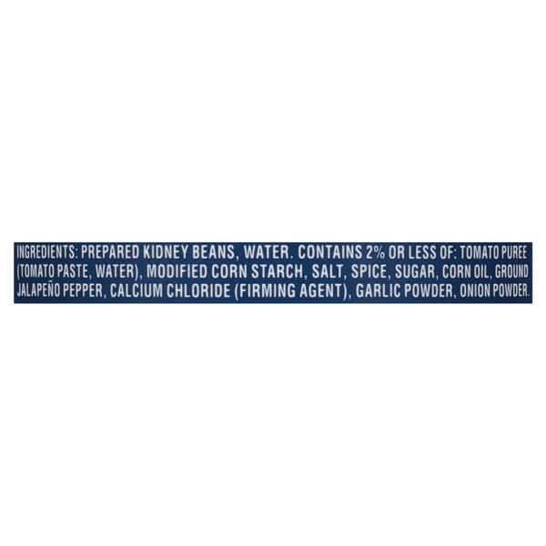 Prepared Kidney Beans, Water, Contains 2% Or Less Of: Tomato Puree (tomato Paste, Water), Modified Corn Starch, Salt, Spice, Sugar, Corn Oil, Ground Jalapeño Pepper, Calcium Chloride (firming Agent), Garlic Powder, Onion Powder