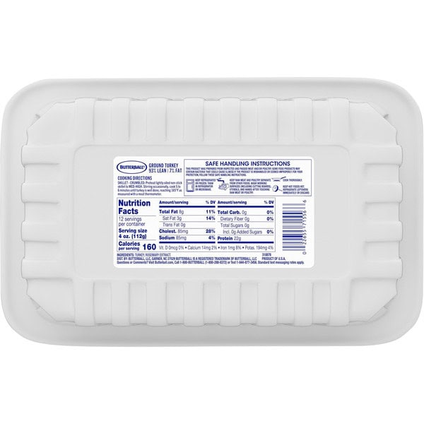 150 calories; 950 mg sodium per serving. 22 g protein. Gluten free. 93% lean. 7% fat. All natural (Minimally processed) (No artificial ingredients). Turkey used has: No added hormones (Federal regulations do not permit the use of hormones or steroids in poultry). Ready to cook. American Humane Certified. Inspected for wholesomeness by US Department of Agriculture. Butterball.com. Questions or Comments? Visit Butterball.com. Call 1-800-butterball (1-800-288-8372) or text 1-844-877-3456. Standard text messaging rates apply. Visit us at Butterball.com for delicious recipes. Product of USA. American Humane CertifiedHumaneHeartland.org