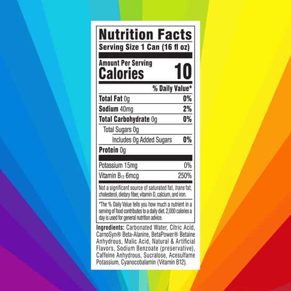 Carbonated Water, Carnosyn® Beta-alanine, L-citrulline, Malic Acid, Betapower® Betaine Anhydrous, Citric Acid, Potassium Sorbate (preservative), Caffeine Anhydrous, Natural Flavors, Sucralose, Acesulfame Potassium, Niacinamide, N-acetyl-l-tyrosine, Cyanocobalamin (vitamin B12)