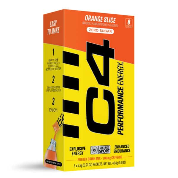 Your favorite performance energy drink now available in an on-the-go” drink mix! Formulated with 200mg caffeine, clinically studied ingredients, and carrying the NSF Certified for Sport® label, C4 Performance Energy® is the athlete’s choice for elevating performance. With ZERO grams of sugar or synthetic dyes, Orange Slice delivers a zesty and refreshing burst of citrusy orange flavor with every sip.