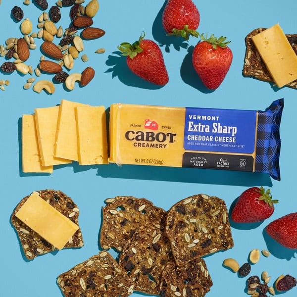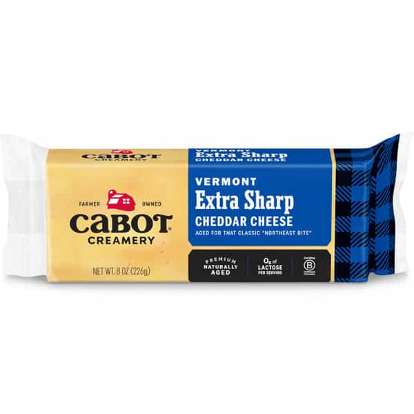 Cabot’s Extra Sharp Yellow Cheddar cheese packs a punch. Luscious in color and crumbly in texture, our Extra Sharp Cheddar is aged 12 months. With hints of grapefruit and bergamot, this cheddar is magnificent melted into cheese sauce, atop a juicy burger or sliced up for a snack all on its own. You simply can’t go wrong with cheddar this good. Pick up a bar today, for an impromptu gluten-free, Extra Sharp snack with zero grams of lactose. Cabot Creamery is a farmer-owned cooperative and certified B-Corp that’s been making award-winning products for over a century.
