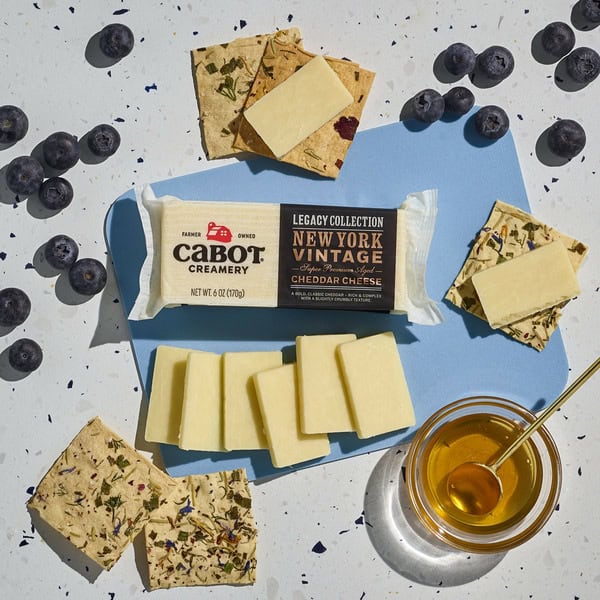 As big and bold as New York, this classic cheddar boasts a complex, layered sharpness. Rich flavors combine with a crumbly texture for a fresh-off-the-dairy-farm experience. Available in 6-ounce Dairy Bars, our New York Vintage is part of our special line of Legacy Collection cheeses. Cabot’s New York Vintage cheddar is made with milk from the New York Farm Families that co-operatively own Cabot.