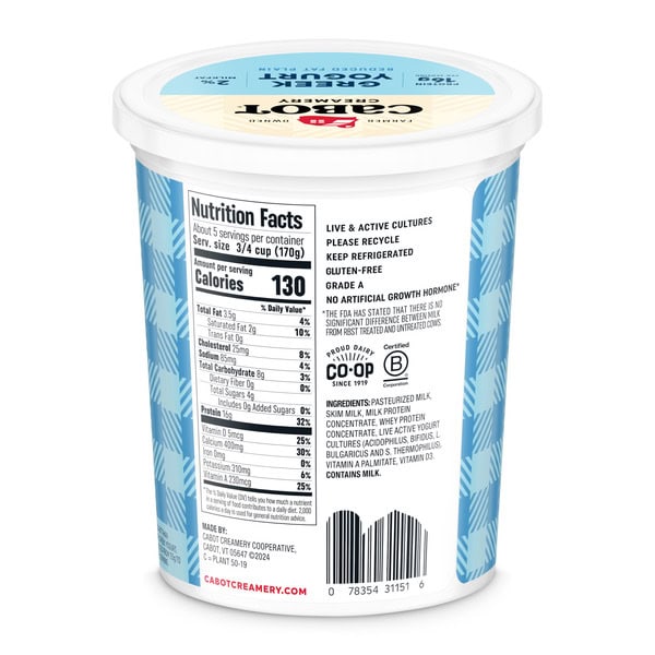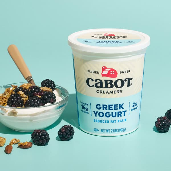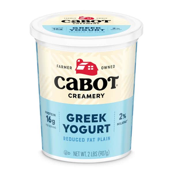 Made with our farmer’s 2 % lowfat milk, Cabot Lowfat Plain Greek Yogurt has the rich, creamy taste you love, but with a lighter touch. Substitute for sour cream when you want to lighten up your favorite recipes, whether you’re serving up soups, Mexican favorites, or baked goods. Or simply top with fruit, honey, or granola for a healthy, delicious breakfast. Also perfect for flavorful dips and spreads. Keep a 2 lb. tub in the fridge at all times, and you’ll be ready for protein-rich snacking and cooking whenever the craving strikes.