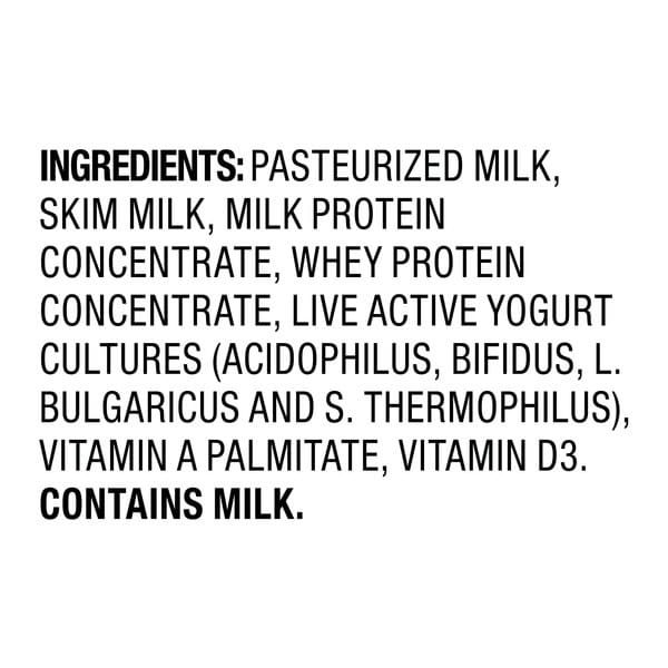 Pasteurized Milk, Skim Milk, Milk Protein Concentrate, Whey Protein Concentrate, Live Active Yogurt Cultures (acidophilus, Bifidus, L. Bulgaricus And S. Thermophilus), Vitamin A Palmitate, Vitamin D3