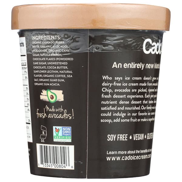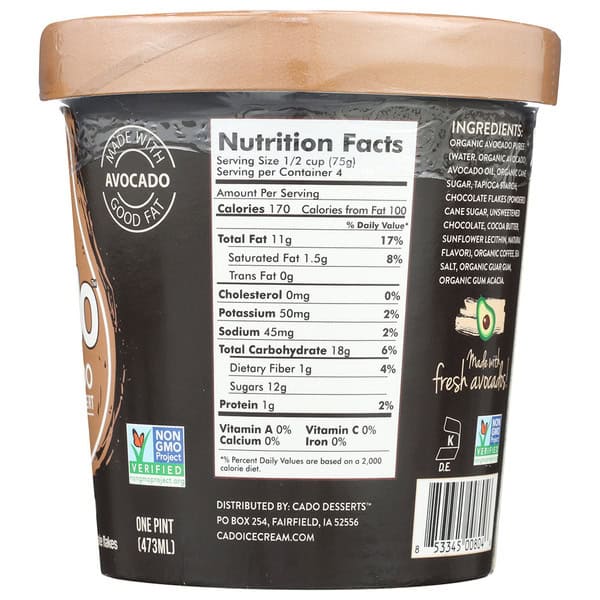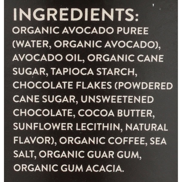 Organic Avocado Puree (water, Organic Avocado), Organic Cane Sugar, Avocado Oil, Organic Cassava Root Syrup, Chocolate Flakes (powdered Cane Sugar, Unsweetened Chocolate, Cocoa Butter, Sunflower Lecithin, Natural Flavor), Organic Coffee, Sea Salt, Organic Guar Gum, Organic Gum Acacia