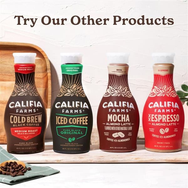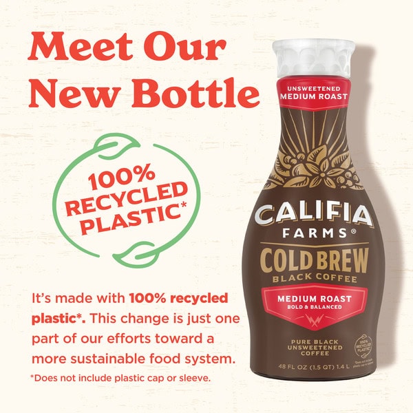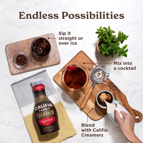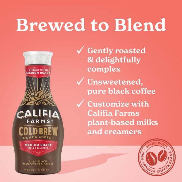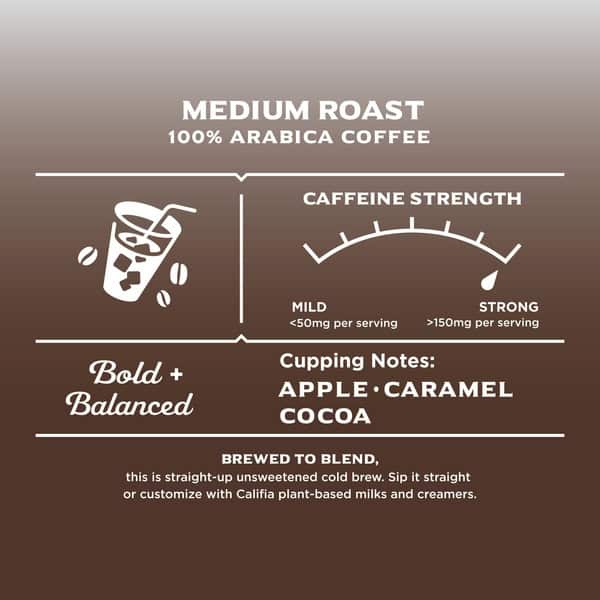 Califia Farms Medium Roast Cold Brew Coffee is your bold and distinctive blank canvas for coffee creativity. Smooth, balanced, and never bitter, it’s made from 100% arabica coffee beans, cold brewed for maximum flavor. With delicate notes of apple, caramel, and cocoa, this unsweetened pure black blend shines on its own or makes the perfect base for your next coffee creation. Swirl in your favorite Califia Farms creamer for a creamy and flavorful iced coffee or sip it straight up for a pure coffee experience. Califia Farms Medium Roast Cold Brew Coffee is as versatile as it is delicious.