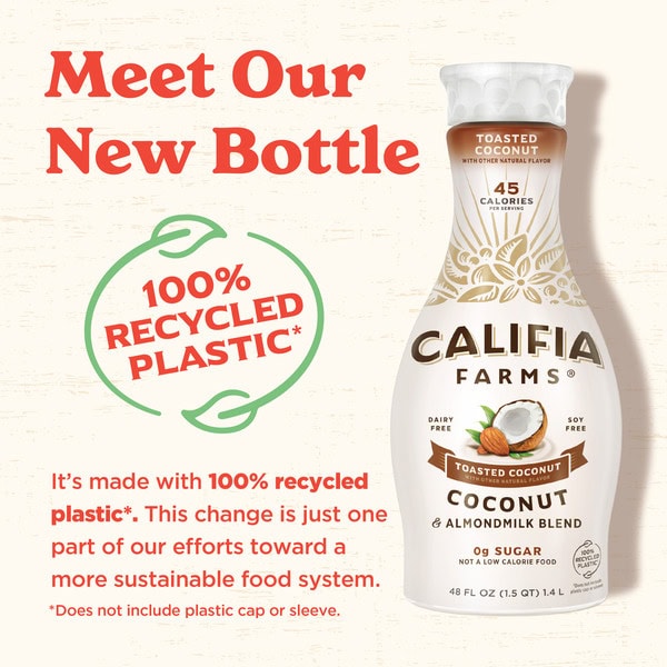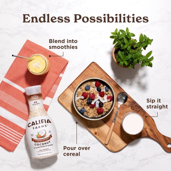 A delightfully drinkable blend of our signature silky-smooth almond milk and real coconut cream, Califia Farms’ Toasted Coconut Almondmilk satisfies every time. With 0g of sugar* and only 45 calories per serving, you’ll savor every rich and creamy drop.Â