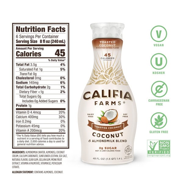 Like all of our plant milks, we make our Toasted Coconut Almondmilk using only simple, non-GMO-certified plant-based ingredients, with no soy, gluten or carrageenan. Every serving is an excellent source of calcium; each cup contains 30% of the recommended daily value.Â