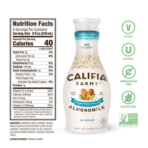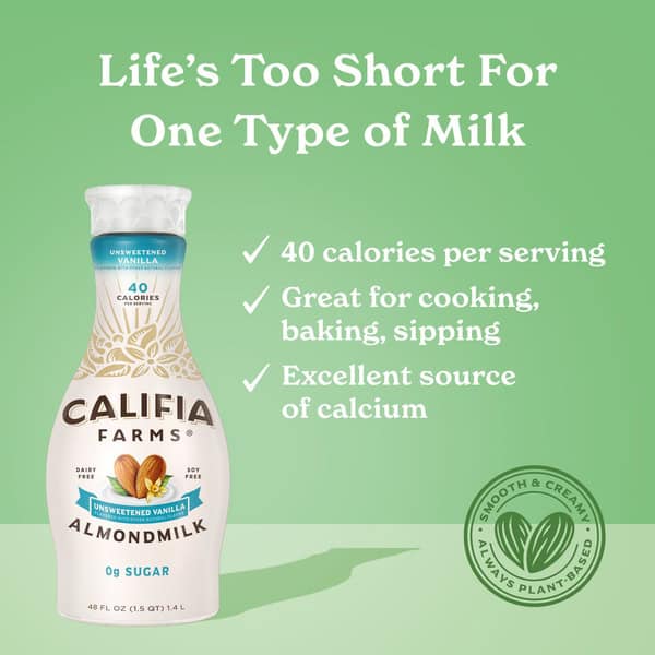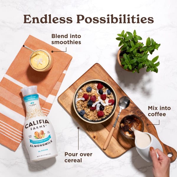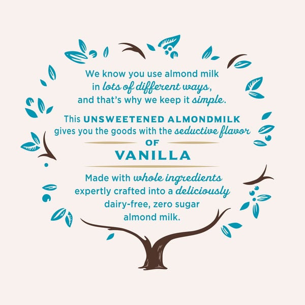 Unsweetened Vanilla Almondmilk is a delight sipped straight from the glass or blended into smoothies. Upgrade any dessert recipe and bake your favorite treats by simply substituting Unsweetened Vanilla Almondmilk in for your dairy milk. Stir it into your coffee, or turn it into plant-based ice cream.Â