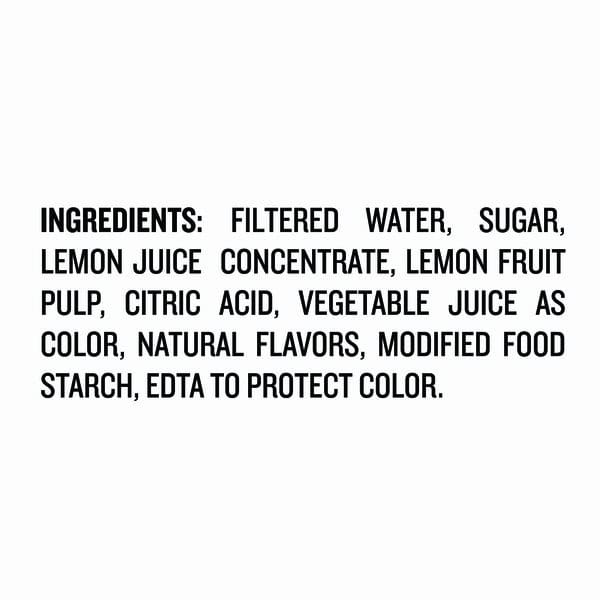 Filtered Water, Sugar, Lemon Juice Concentrate, Lemon Fruit Pulp, Citric Acid, Vegetable Juice As Color, Natural Flavors, Modified Food Starch, Edta To Protect Color