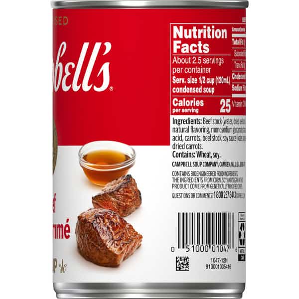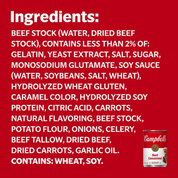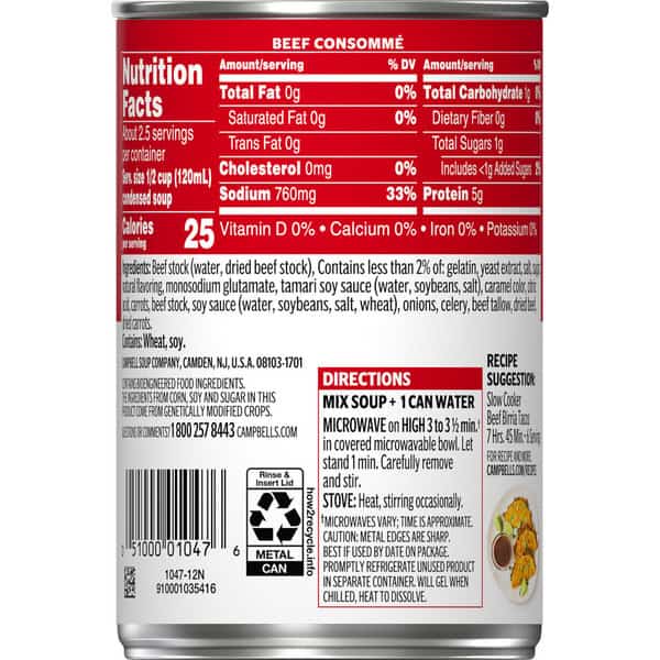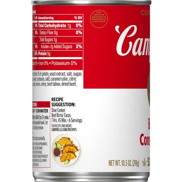 Add rich, savory flavor to your favorite dishes with Campbell’s® Condensed Beef Consomme Soup. A convenient alternative to beef bouillon, this beef consomme is crafted with high-quality beef stock and seasoned to perfection to provide a delicious foundation to any recipe. Use it as the hero ingredient in recipes like Slow Cooker Beef Birria Tacos, try it as a stew or soup base, or add it to homemade gravies, sauces and more. Campbell’s® convenient canned soup is a year-round pantry staple and a must-have for creating something quick and easy. It’s also delicious on its own, topped with fresh herbs or a drizzle of olive oil, or enjoyed with a sandwich or salad. Simply mix the condensed soup with 1 can of water and microwave on high for 3 to 3.5 minutes in a covered microwave-safe bowl, or heat in a pot on the stove, stirring occasionally. Each 10.5 oz recyclable can contains about 2.5 servings of microwave soup and features a non-BPA lining. From Beef Consomme to Chicken Noodle and everything in between, Campbell’s® makes delicious soups in flavors your family knows and loves, with quality, farm-grown ingredients in every can. M’m! M’m! Good!®