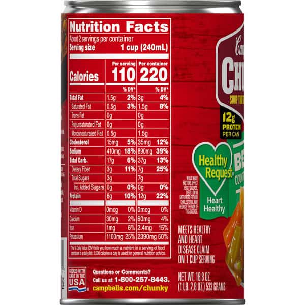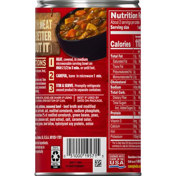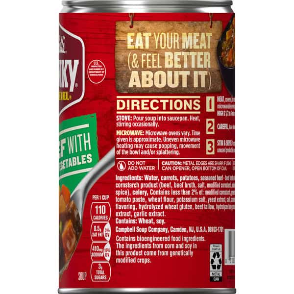 Campbell’s® Chunky® Healthy Request® Beef Soup with Country Vegetables isn’t just tasty—it’s made to work as hard as you do. With never-ending big flavors and bold ingredients, this canned soup is capable of fueling even the heartiest appetite. This ready-to-eat beef vegetable soup is crafted with carrots, potatoes and hearty pieces of tender beef to create a flavorful recipe that satisfies. It Fills You Up Right®. Just pop this ready-to-serve soup in a microwave-safe bowl, heat and enjoy with your favorite sides. Or, warm it over the campfire on your outdoor adventures. Whether you’re looking for quick and easy to microwave soup for home or something to take on the go, Campbell’s® has you covered. The soup can is recyclable for easy disposal. Take on the great outdoors with Campbell’s® Chunky® Healthy Request® Beef Soup with Country Vegetables—Soup That Eats Like a Meal®.