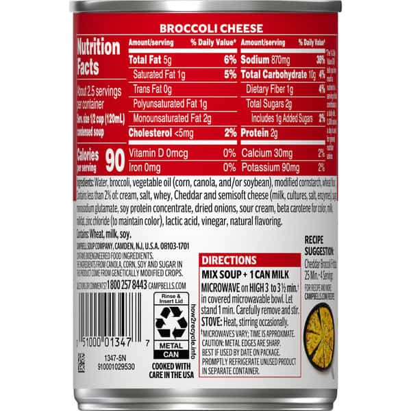 Add rich, cheesy flavor to your favorite dishes with Campbell’s® Condensed Broccoli Cheese Soup. This vegetarian soup is crafted with broccoli, rich cheddar cheese and farm-fresh cream to provide a deliciously smooth foundation to any recipe. Use it as the hero ingredient in recipes like Cheddar Broccoli Frittata, try it as a broccoli cheddar soup base, or substitute it for roux or bechamel as a sauce starter. Campbell’s® convenient canned soup is a year-round pantry staple and a must-have for creating something quick and easy. This cheddar broccoli soup is also delicious on its own, topped with fresh herbs or a drizzle of olive oil, or enjoyed with a sandwich or salad. Simply mix the condensed soup with 1 can of milk and microwave on high for 3 to 3.5 minutes in a covered microwave-safe bowl, or heat in a pot on the stove, stirring occasionally. Each 10.5 oz recyclable can contains about 2.5 servings of microwave soup and features a non-BPA lining. From Broccoli Cheese to Chicken Noodle and everything in between, Campbell’s® makes delicious soups in flavors your family knows and loves, with quality, farm-grown ingredients in every can. M’m! M’m! Good!®