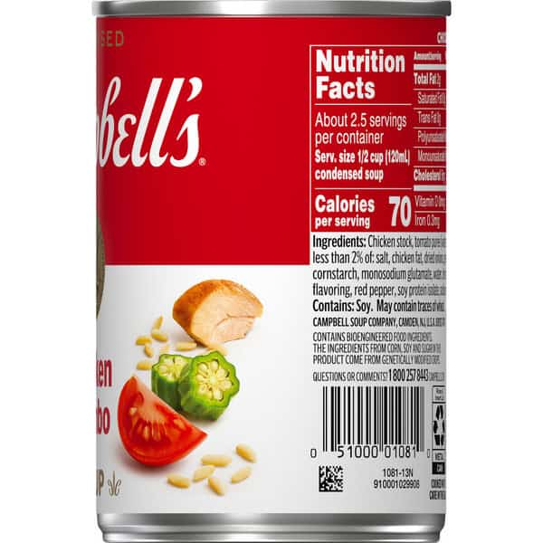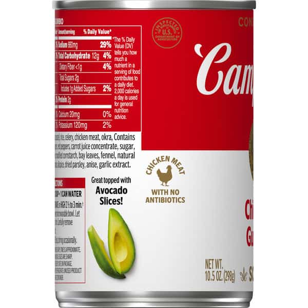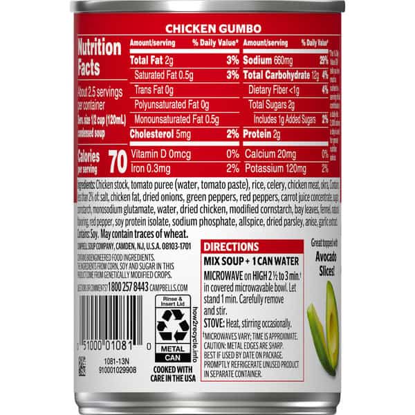 Cozy up with a steamy bowl of Campbell’s® Condensed Chicken Gumbo Soup. A family favorite for generations, this chicken soup is crafted with rice, chicken meat with no antibiotics, and farm-grown veggies like celery, okra and peppers in a savory, spice-laden broth. The result is a satisfying chicken gumbo soup that brings a smile with every spoonful. Top it with avocado slices, season it with fresh herbs, or pair it with a sandwich or salad for something quick and easy. This convenient canned soup is a year-round pantry staple and the perfect comfort food on a chilly day or when you’re feeling under the weather. Simply mix the condensed soup with 1 can of water and microwave on high for 2.5 to 3 minutes in a covered microwave-safe bowl, or heat in a pot on the stove, stirring occasionally. Each 10.5 oz recyclable can contains about 2.5 servings of microwave soup and features a non-BPA lining. From Chicken Gumbo to Cream of Mushroom and everything in between, Campbell’s® makes delicious soups in flavors your family knows and loves, with quality, farm-grown ingredients in every can. M’m! M’m! Good!®