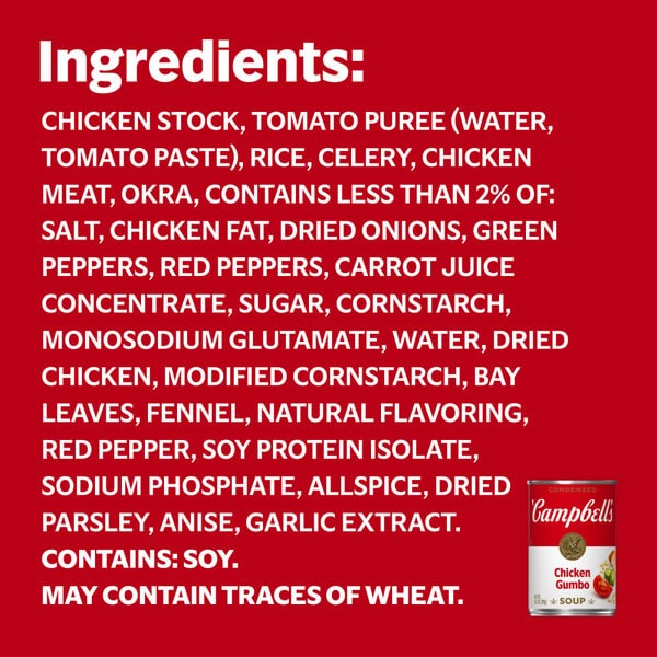 Chicken Stock, Tomato Puree (water, Tomato Paste), Rice, Celery, Chicken Meat, Okra, Contains Less Than 2% Of Salt, Chicken Fat, Dried Onions, Green Peppers, Red Peppers, Carrot Juice Concentrate, Sugar, Cornstarch, Monosodium Glutamate, Water, Dried Chicken, Modified Cornstarch, Bay Leaves, Fennel, Natural Flavoring, Red Pepper, Soy Protein Isolate, Sodium Phosphate, Allspice, Dried Parsley, Anise, Garlic Extract