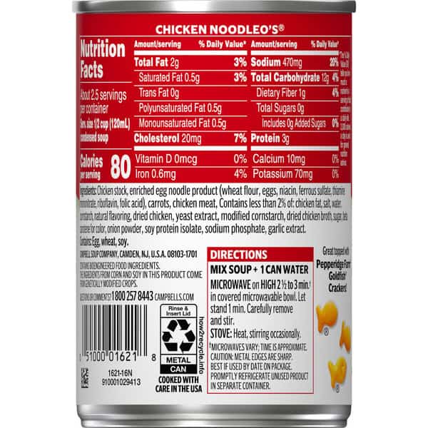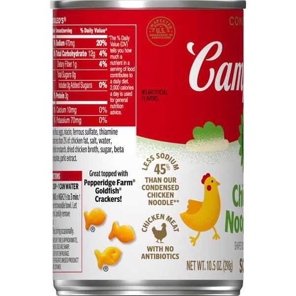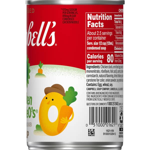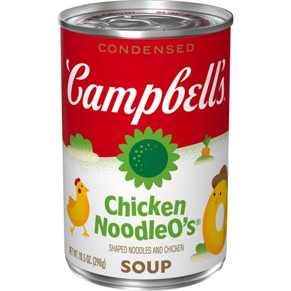 Make mealtime fun with a bowl of Campbell’s® Condensed Kids Chicken NoodleO’s® Soup. Loved by kids and parents alike, this delightful and delicious chicken noodle soup is crafted with O-shaped noodles, carrots, and tender chicken meat with no antibiotics, all in a savory chicken broth. The result is a kid-friendly chicken soup with 45% less sodium than our regular condensed chicken noodle.* Top this playful kids soup with Pepperidge Farm® Goldfish® Crackers, or pair it with a sandwich for something quick and easy. Our convenient canned soup is a year-round pantry staple and the perfect comfort food on a chilly day or when your kiddo’s feeling under the weather. Simply mix the condensed soup with 1 can of water and microwave on high for 2.5 to 3 minutes in a covered microwave-safe bowl, or heat in a pot on the stove, stirring occasionally. Each 10.5 oz recyclable can contains about 2.5 servings of microwave soup and features a non-BPA lining. Campbell’s® makes delicious soups in flavors your family knows and loves, with quality, farm-grown ingredients in every can. M’m! M’m! Good!® (*Contains 470mg sodium per serving vs. 890mg in our condensed chicken noodle)