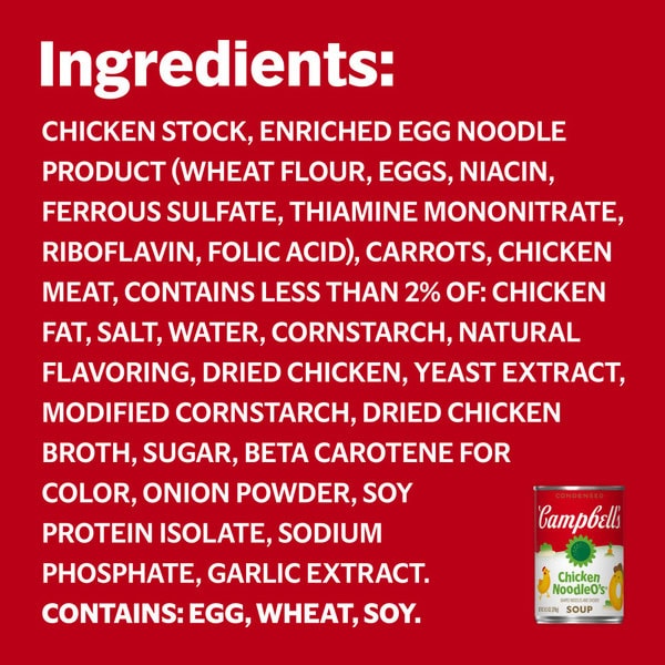 Chicken Stock, Enriched Egg Noodle Product (wheat Flour, Eggs, Niacin, Ferrous Sulfate, Thiamine Mononitrate, Riboflavin, Folic Acid), Carrots, Chicken Meat, Contains Less Than 2% Of: Chicken Fat, Salt, Water, Cornstarch, Natural Flavoring, Dried Chicken, Yeast Extract, Modified Cornstarch, Dried Chicken Broth, Sugar, Beta Carotene For Color, Onion Powder, Soy Protein Isolate, Sodium Phosphate, Garlic Extract