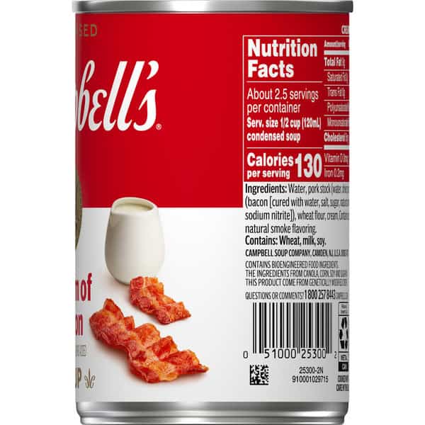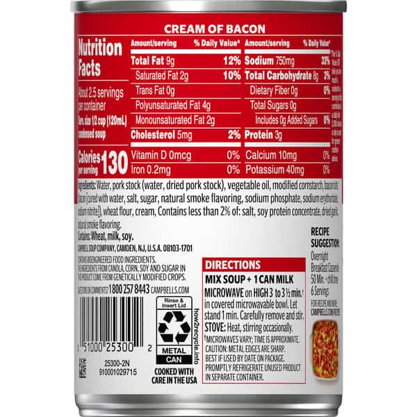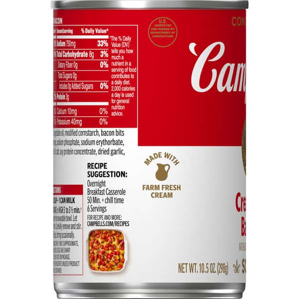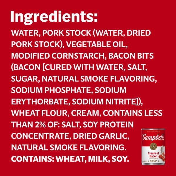 Add rich, creamy flavor to your favorite dishes with Campbell’s® Condensed Cream of Bacon Soup With Natural Smoke Flavoring Added. This creamy bacon soup is crafted with farm-fresh cream, pork stock and bacon bits to provide a deliciously smooth foundation to any recipe. Use it as the hero ingredient in dishes like Overnight Breakfast Casserole, or substitute it for roux or bechamel as a sauce starter. Campbell’s® convenient canned soup is a year-round pantry staple and a must-have for creating something quick and easy. It’s also delicious on its own, topped with fresh herbs or a drizzle of olive oil, or enjoyed with a sandwich or salad. Simply mix the condensed soup with 1 can of milk and microwave on high for 3 to 3.5 minutes in a covered microwave-safe bowl, or heat in a pot on the stove, stirring occasionally. Each 10.5 oz recyclable can contains about 2.5 servings of microwave soup and features a non-BPA lining. From Cream of Bacon to Chicken Noodle and everything in between, Campbell’s® makes delicious soups in flavors your family knows and loves, with quality, farm-grown ingredients in every can. M’m! M’m! Good!®