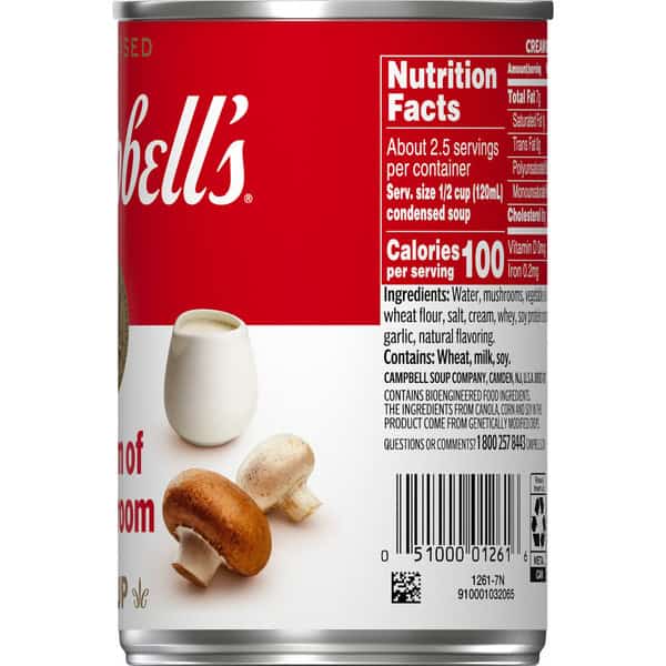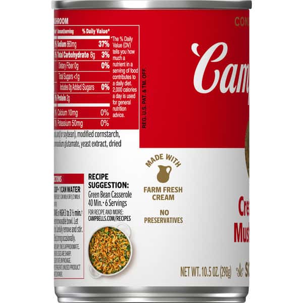 Add rich, creamy flavor to your favorite dishes with Campbell’s® Condensed Cream of Mushroom Soup. This vegetarian soup is crafted with mushrooms, garlic and farm-fresh cream to provide a deliciously smooth foundation to any recipe. Use it as the hero ingredient in recipes like Green Bean Casserole and Swedish Meatballs, or substitute it for roux or bechamel as a sauce starter. Campbell’s® convenient canned soup is a year-round pantry staple and a must-have for creating something quick and easy. It’s also delicious on its own, topped with fresh herbs or a drizzle of olive oil, or enjoyed with a sandwich or salad. Simply mix the condensed soup with 1 can of water or milk and microwave on high for 3 to 3.5 minutes in a covered microwave-safe bowl, or heat in a pot on the stove, stirring occasionally. Each 10.5 oz recyclable can contains about 2.5 servings of microwave soup and features a non-BPA lining. From Cream of Mushroom to Chicken Noodle and everything in between, Campbell’s® makes delicious soups in flavors your family knows and loves, with quality, farm-grown ingredients in every can. M’m! M’m! Good!®