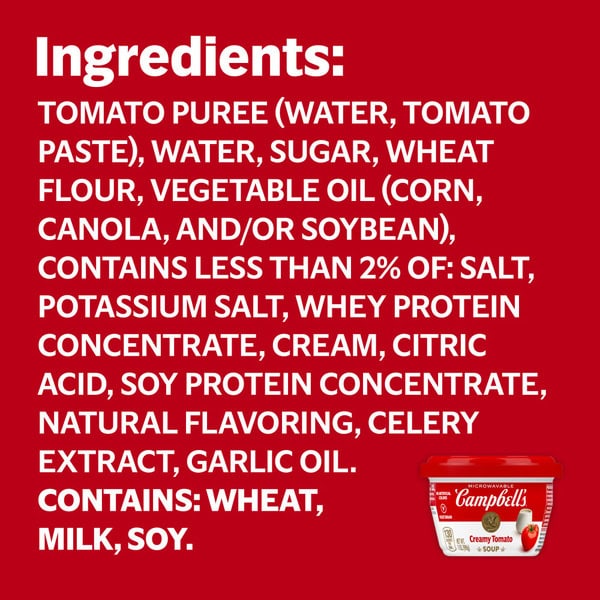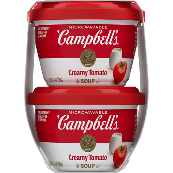 Take this twist on classic flavors you know and love on the road with Campbell’s® Creamy Tomato Soup. Every spoonful of this comforting tomato soup is crafted with delicious ingredients you grew up on. The tangy taste of sun-ripened tomatoes and dairy cream makes this soup a delicious and nostalgic choice anytime, anywhere. This vegetarian soup is made without high fructose corn syrup or artificial colors for a snack you can feel good about. Just pop off the cap, peel back the cover, replace the cap and microwave for one minute. Let this easy to microwave soup sit for another minute and enjoy! Take this instant soup on the go for an easy, portable snack, appetizer or side dish for a delicious lunch. The microwavable soup bowl makes it easy to enjoy, no dishes required. Embark on your next adventure with Campbell’s® soups along for the ride. M’m M’m Good!®