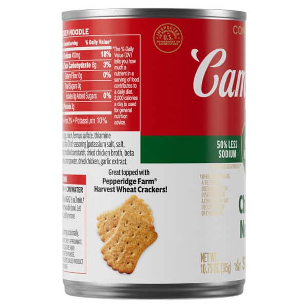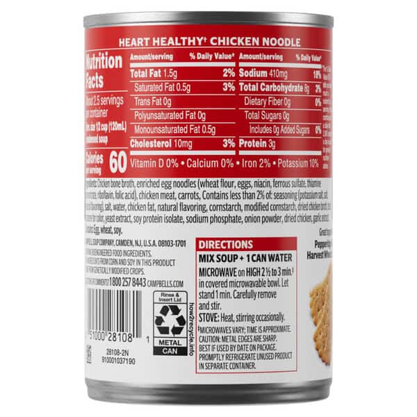 Cozy up with a steamy bowl of Campbell’s® Condensed Heart Healthy* Chicken Noodle Soup. This delicious chicken soup is crafted with chicken bone broth, fresh egg noodles, and tender chicken meat with no antibiotics. The result is a heart healthy soup* with 50% less sodium than our regular product.** Top this canned chicken noodle soup with Pepperidge Farm® Harvest Wheat Crackers, season it with fresh herbs, or pair it with a sandwich or salad for something quick and easy. Our convenient canned soup is a year-round pantry staple and the perfect comfort food on a chilly day or when you’re feeling under the weather. Simply mix the condensed soup with 1 can of water and microwave on high for 2.5 to 3 minutes in a covered microwave-safe bowl, or heat in a pot on the stove, stirring occasionally. Each 10.75 oz recyclable can contains about 2.5 servings of microwave soup and features a non-BPA lining. (*While many factors affect heart disease, diets low in saturated fat and cholesterol may reduce the risk of this disease. **Contains 410mg sodium per serving vs. 890mg in our regular chicken noodle)