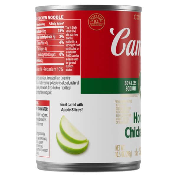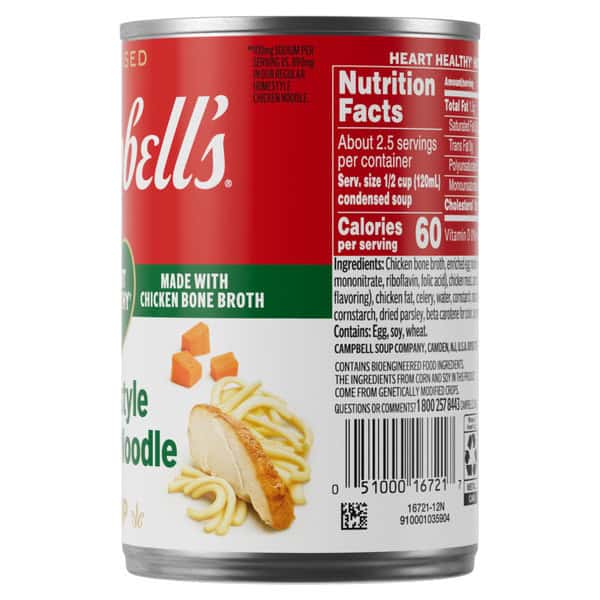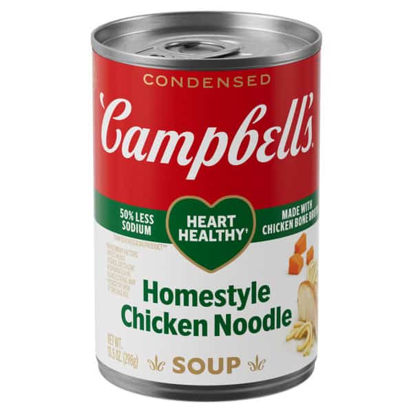 Cozy up with a steamy bowl of Campbell’s® Condensed Heart Healthy* Homestyle Chicken Noodle Soup. This delicious chicken soup is crafted with chicken bone broth, egg noodles, and tender chicken meat with no antibiotics. The result is a heart healthy soup* with 50% less sodium than our regular product.** Top it with Pepperidge Farm® Harvest Wheat Crackers, season it with fresh herbs, or pair it with apple slices or a salad for something quick and easy. Our convenient canned soup is a year-round pantry staple and the perfect comfort food on a chilly day or when you’re feeling under the weather. Simply mix the condensed soup with 1 can of water and microwave on high for 2.5 to 3 minutes in a covered microwave-safe bowl, or heat in a pot on the stove, stirring occasionally. Each 10.5 oz recyclable can contains about 2.5 servings of microwave soup and features a non-BPA lining. (*While many factors affect heart disease, diets low in saturated fat and cholesterol may reduce the risk of this disease. **Contains 410mg sodium per serving vs. 890mg in our regular Homestyle Chicken Noodle)