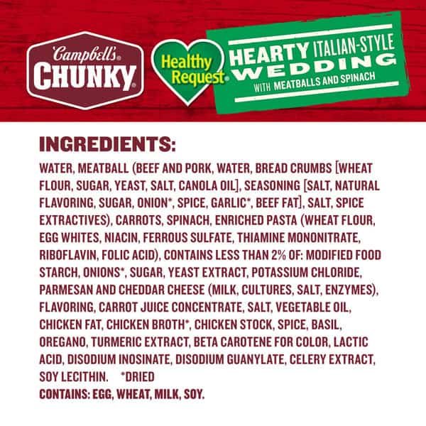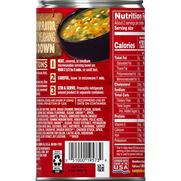 Water, Meatball (beef And Pork, Water, Breadcrumbs [wheat Flour, Cane Sugar, Yeast, Sea Salt, Canola Oil), Seasoning [salt, Natural Flavoring, Sugar, Onion Powder, Spice, Garlic Powder, Beef Fat], Salt, Spice Extractives), Carrots, Spinach, Enriched Pasta (wheat Flour, Egg Whites, Niacin, Ferrous Sulfate, Thiamine Mononitrate, Riboflavin, Folic Acid), Contains Less Than 2% Of: Modified Food Starch, Dehydrated Onions, Yeast Extract, Sugar, Potassium Chloride, Carrot Juice Concentrate, Flavoring, Cheddar Cheese (milk, Cultures, Salt, Enzymes), Parmesan Cheese (milk, Cultures, Salt, Enzymes), Salt, Vegetable Oil, Chicken Fat, Dehydrated Chicken Broth, Spices, Lower Sodium Natural Sea Salt, Chicken Stock, Beta Carotene For Color, Turmeric Extract, Lactic Acid, Disodium Inosinate, Disodium Guanylate, Celery Extract, Soy Lecithin, Garlic Extract.