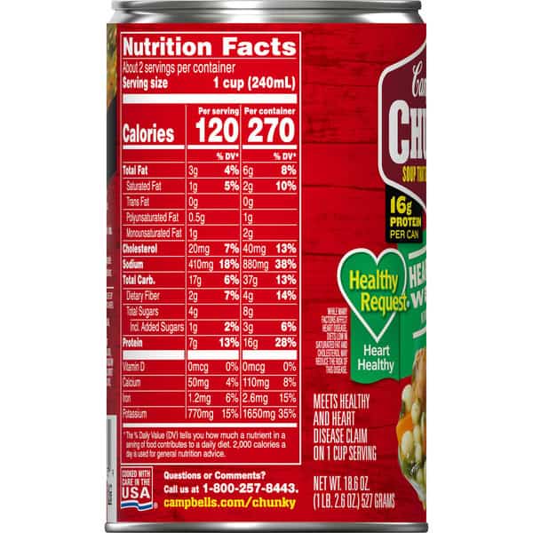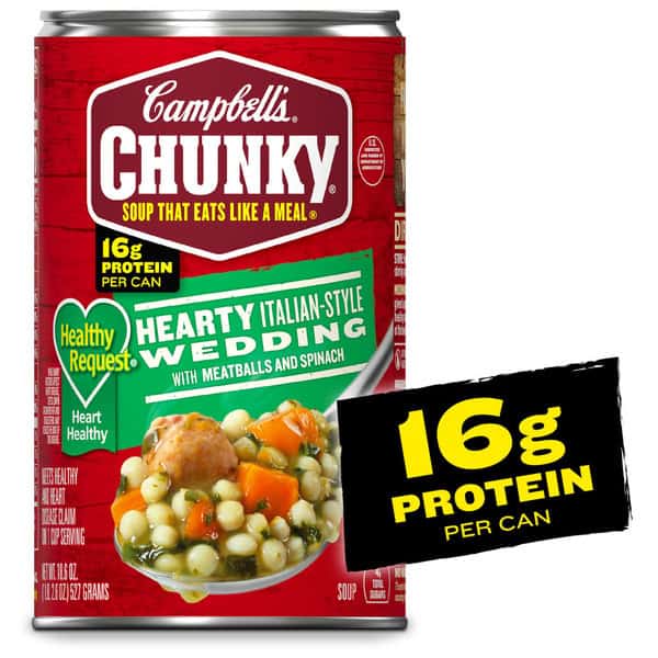 Campbell’s® Chunky® Healthy Request® Hearty Italian Wedding Soup isn’t just tasty—it’s made to work as hard as you do. With never-ending big flavors and bold ingredients, this canned soup is capable of fueling even the heartiest appetite. This ready-to-eat soup is crafted with meatballs, carrots, spinach and enriched pasta to deliver a satisfying soup. Each can has 16 grams of protein. It Fills You Up Right®. Just pop this ready-to-serve soup in a microwave-safe bowl, heat and enjoy with your favorite sides. Or, warm it over the campfire on your outdoor adventures. Whether you’re looking for quick and easy to microwave soup for home or something to take on the go, Campbell’s® has you covered. The soup can is recyclable for easy disposal. Take on the great outdoors with Campbell’s® Chunky® Healthy Request® Hearty Italian Wedding Soup—Soup That Eats Like a Meal®.