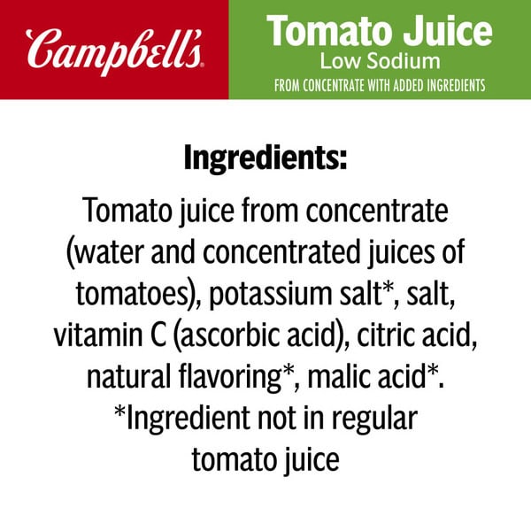 Experience a delicious blend of taste and nutrition with Campbell’s® Low Sodium 100% Tomato Juice. Crafted with juicy, vine-ripened tomatoes picked at peak season, Campbell’s® low sodium tomato juice has the rich and consistently smooth flavor you enjoy and expect from America’s No. 1 brand. Packed with goodness, each 8 fl oz serving of this 100% juice is a good source of Vitamin C and contains only 140mg of sodium. Our tomato-based vegetable juice is also gluten-free, non-GMO and vegetarian. Enjoy it on its own, over ice with a twist of lime, or seasoned with pepper and adorned with your favorite garnishes. It’s great as a breakfast drink or afternoon snack and makes a perfect mocktail or cocktail mixer. In addition to sipping it as a vegetable drink, you can also use Campbell’s® Low Sodium 100% Tomato Juice to add flavor and nutrition to a variety of dishes. Try it as a tomato sauce or tomato soup base, add it to homemade chili, or use it as a marinade for meat and vegetables. With great flavor and nutritious benefits, it’s no wonder why Campbell’s® is the No. 1 tomato juice in America.