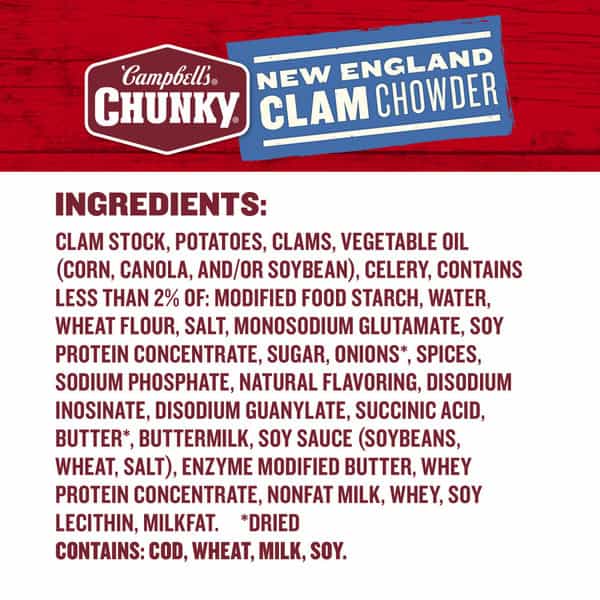 Clam Stock, Potatoes, Clams, Vegetable Oil (corn, Canola, And/or Soybean), Celery, Contains Less Than 2% Of: Modified Food Starch, Water, Wheat Flour, Salt, Monosodium Glutamate, Soy Protein Concentrate, Sugar, Onions**, Spices, Sodium Phosphate, Natural Flavoring, Disodium Inosinate, Disodium Guanylate, Succinic Acid, Butter**, Buttermilk, Soy Sauce (soybeans, Wheat, Salt), Enzyme Modified Butter, Whey Protein Concentrate, Nonfat Milk, Whey, Soy Lecithin, Milkfat, **dried