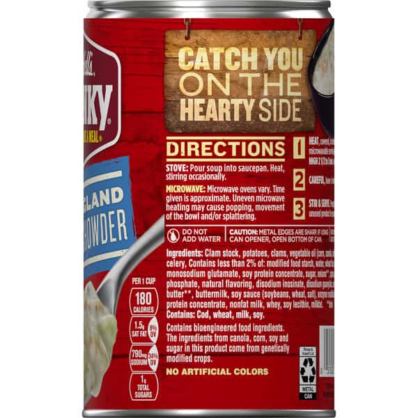 Campbell’s® Chunky® New England Clam Chowder isn’t just about taste. This rich, flavorful and hearty soup showcases the authenticity of its East Coast recipe in every bite. A classic comfort food, this delicious soup is crafted with generous pieces of succulent clam and hearty potatoes. Each can has 12 grams of protein (1). It Fills You Up Right®. Just pop this soup into a saucepan or microwave-safe bowl, heat and enjoy. Or, heat it over the campfire on your outdoor adventures. Kick up it up a notch by pouring this hearty chowder into a bread bowl. Whether you’re looking for quick and easy microwave soups for home or something to take on the go, Campbell’s® has you covered. The soup can is recyclable for easy disposal. Take on the great outdoors with Campbell’s® Chunky® New England Clam Chowder—Soup That Eats Like a Meal®.