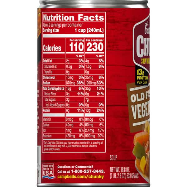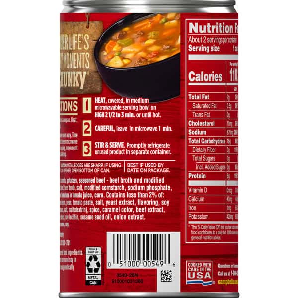Campbell’s® Chunky® Old Fashioned Vegetable Beef Soup isn’t just tasty—it’s made to work as hard as you do. With never-ending big flavors and bold ingredients, this canned soup is capable of fueling even the heartiest appetite. This ready-to-eat beef vegetable soup overflows with flavor-packed hearty veggies like carrots, potatoes, celery, corn and peas, and big pieces of tender beef. Each can has 13 grams of protein. It Fills You Up Right®. Just pop this ready-to-serve soup in a microwave-safe bowl, heat and enjoy with your favorite sides. Or, warm it over the campfire on your outdoor adventures. Whether you’re looking for quick and easy to microwave soup for home or something to take on the go, Campbell’s® has you covered. The soup can is recyclable for easy disposal. Take on the great outdoors with Campbell’s® Chunky® Old Fashioned Vegetable Beef Soup—Soup That Eats Like a Meal®.
