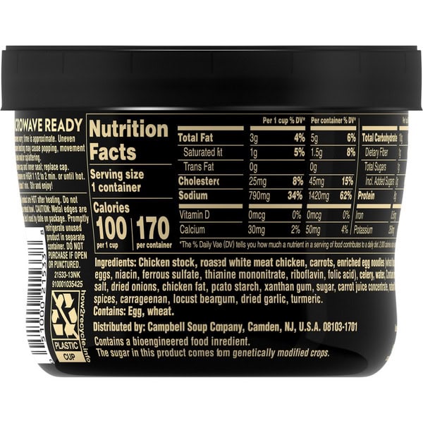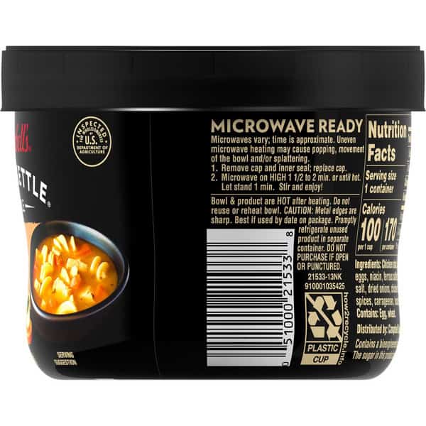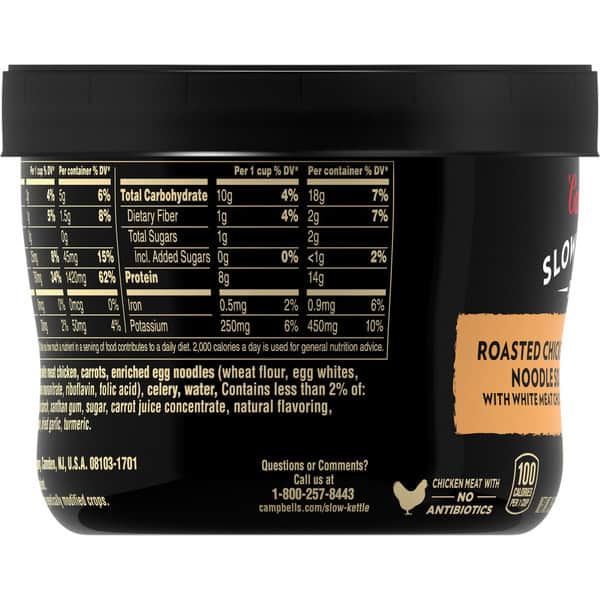 Carefully crafted by Campbell’s® chefs, Slow Kettle® Style Roasted Chicken Noodle Soup with White Meat Chicken is a savory chicken noodle soup that’s slow-cooked to perfection for rich flavor. Simmered with the perfect combination of roasted white meat chicken raised without antibiotics, carrots, and enriched egg noodles, this restaurant-quality chicken noodle soup will make you want to slow down and savor each and every spoonful. Conveniently packaged in a microwavable bowl, Slow Kettle® Style Roasted Chicken Noodle Soup with White Meat Chicken is ready in just minutes so you can add delicious indulgence to your meal, wherever you are. Plus, Slow Kettle® Style Roasted Chicken Noodle Soup with White Meat Chicken is made with no colors from artificial sources.