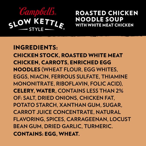 Chicken Stock, Roasted White Meat Chicken, Carrots, Enriched Egg Noodles (wheat Flour, Egg Whites, Eggs, Niacin, Ferrous Sulfate, Thiamine Mononitrate, Riboflavin, Folic Acid), Celery, Water, Contains Less Than 2% Of: Salt, Dried Onions, Chicken Fat, Potato Starch, Xanthan Gum, Sugar, Carrot Juice Concentrate, Natural Flavoring, Spices, Carrageenan, Locust Bean Gum, Dried Garlic, Turmeric
