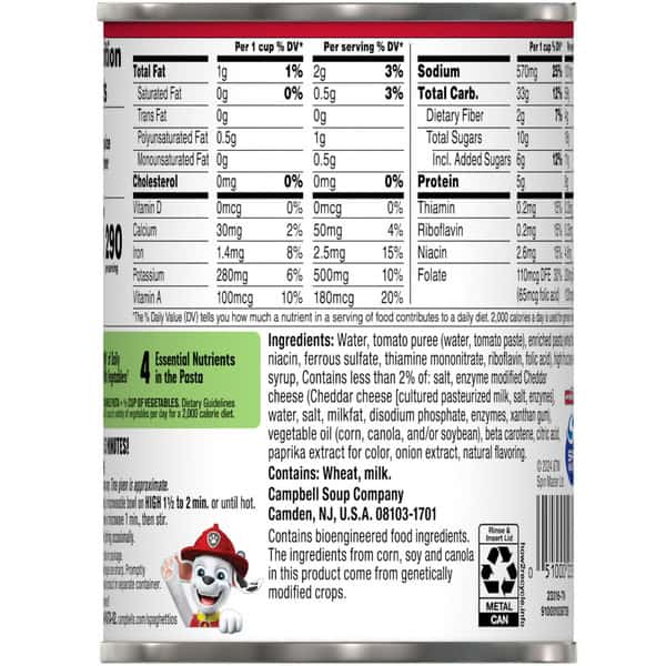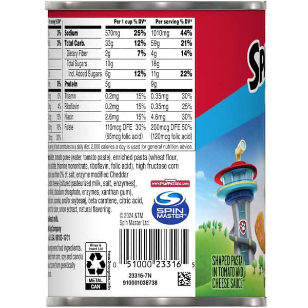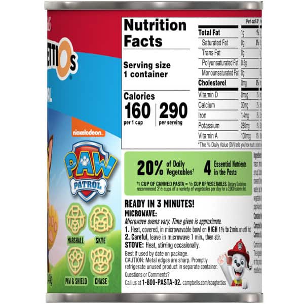 Make mealtime an adventure with SpaghettiOs® Original Canned Pasta With Paw Patrol® Shapes. This playful kids’ pasta features fun, Paw Patrol®-themed pasta shapes – including Chase, Skye, Marshall, and a paw print shield – in a rich tomato and cheese sauce. One cup of SpaghettiOs® contains 4 essential nutrients and 20% of the daily recommended vegetables*, making it a delicious and nutritious kids’ food. Serve this convenient microwave pasta as part of a quick and easy dinner or lunch for kids and kids at heart. Comforting and nostalgic, it’s tasty on its own and pairs perfectly with a grilled cheese sandwich. To prepare, simply microwave for 1.5 to 2 minutes in a covered, microwave-safe bowl, or heat in a pot on the stove, stirring occasionally. In addition to classic O-shaped pasta rings, SpaghettiOs® are available with a variety of familiar friends that add character to every bite. Grab a spoon (or fork) and dig into something the whole family can enjoy with SpaghettiOs® Original Canned Pasta. (*1 cup of canned pasta = 1/2 cup of vegetables; dietary guidelines recommend 2 1/2 cups of vegetables per day for a 2,000 calorie diet)