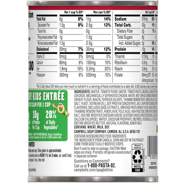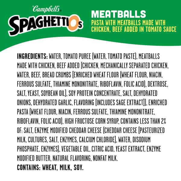 Water, Tomato Puree (water, Tomato Paste), Meatballs Made With Chicken, Beef Added (chicken, Mechanically Separated Chicken, Water, Beef, Bread Crumbs [enriched Wheat Flour (wheat Flour, Niacin, Ferrous Sulfate, Thiamine Mononitrate, Riboflavin, Folic Acid), Dextrose, Salt, Yeast, Soybean Oil], Soy Protein Concentrate, Salt, Dehydrated Onions, Dehydrated Garlic, Flavoring [includes Sage Extract]), Enriched Pasta (wheat Flour, Niacin, Ferrous Sulfate, Thiamine Mononitrate, Riboflavin, Folic Acid), High Fructose Corn Syrup, Contain Less Than 2% Of: Salt, Enzyme Modified Cheddar Cheese (cheddar Cheese [pasteurized Milk, Cultures, Salt, Enzymes, Calcium Chloride], Water, Disodium Phosphate, Enzymes), Vegetable Oil, Citric Acid, Yeast Extract, Enzyme Modified Butter, Natural Flavoring, Nonfat Milk