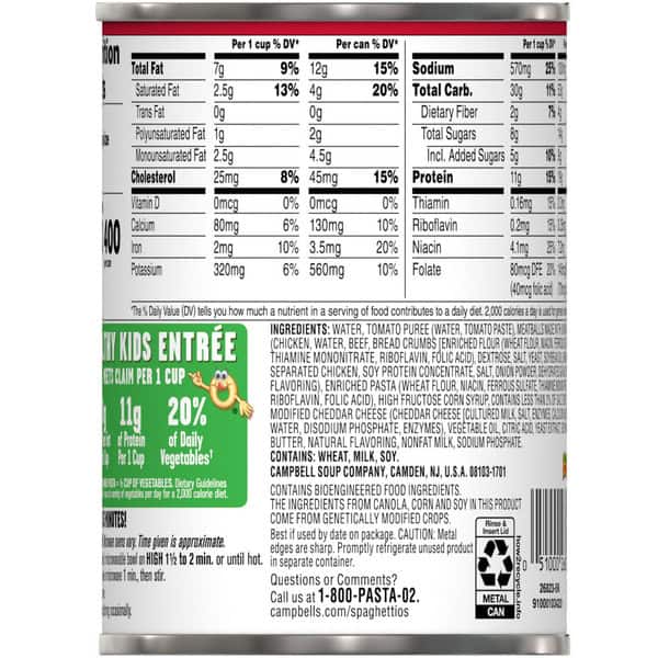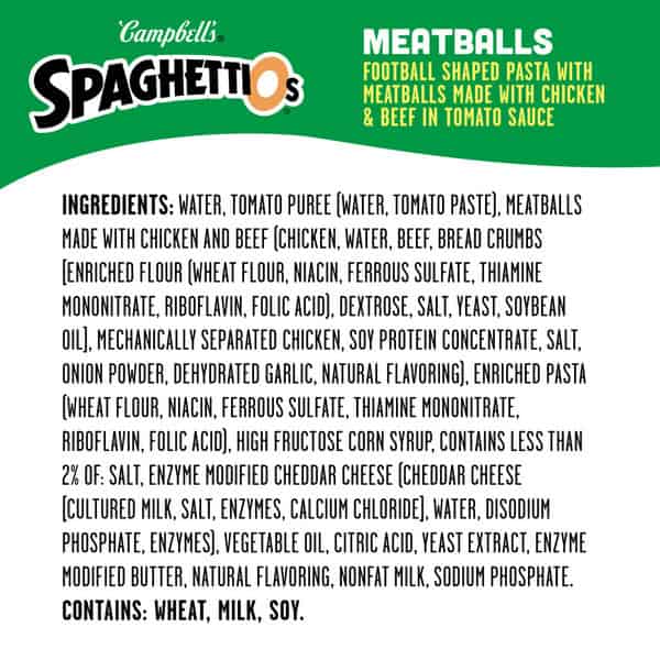 Water, Tomato Puree (water, Tomato Paste), Meatballs Made With Chicken And Beef (chicken, Water, Beef, Bread Crumbs [enriched Flour (wheat Flour, Niacin, Ferrous Sulfate, Thiamine Mononitrate, Riboflavin, Folic Acid), Dextrose, Salt, Yeast, Soybean Oil], Mechanically Separated Chicken, Soy Protein Concentrate, Salt, Onion Powder, Dehydrated Garlic, Natural Flavoring), Enriched Past (wheat Flour, Niacin, Ferrous Sulfate, Thiamine Mononitrate, Riboflavin, Folic Acid), High Fructose Corn Syrup, Contains Less Than 2% Of: Salt, Enzyme Modified Cheddar Cheese (cheddar Cheese [cultured Milk, Salt, Enzymes, Calcium Chloride], Water, Disodium Phosphate, Enzymes), Vegetable Oil, Citric Acid, Yeast Extract, Enzyme Modified Butter, Natural Flavoring, Nonfat Milk, Sodium Phosphate.
