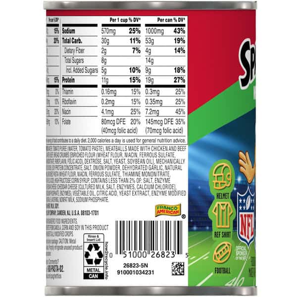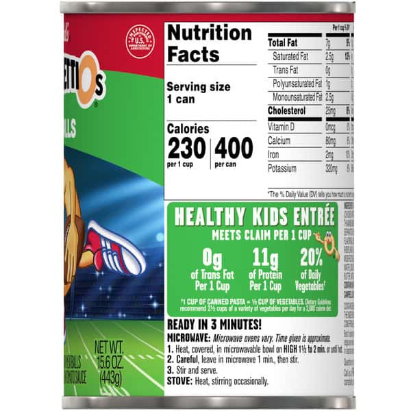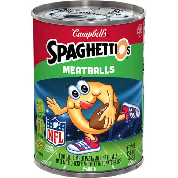 Dig into a dish the whole family will enjoy with SpaghettiOs® Football Shaped Canned Pasta with Meatballs. Each delicious bite of this canned pasta and meatballs features the classic o-shaped pasta you know and love, plus football pasta shapes to add some fun to lunchtime. This canned pasta puts a yummy spin on original SpaghettiOs® with the addition of savory meatballs, making it a delicious part of any meal. One cup of football shaped SpaghettiOs with meatballs contains 1/2 cup of vegetables and 11 grams of protein as a part of lunch. Break out this convenient canned food when you’re craving lunch, or prepare it as an entree for a fun kids lunch. This microwave pasta is ready in as little as 3 minutes. Just heat in a microwave-safe bowl on high for 1 1/2 to 2 minutes, let stand for 1 minute, then stir. Or, cook up this fun-loving pasta on the stove. The can is recyclable for easy disposal. Add character to every bite with SpaghettiOs®: the neat round spaghetti you can eat with a spoon.