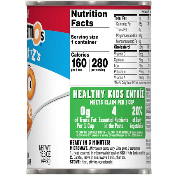 Dig into a dish the whole family will enjoy with SpaghettiOs® Original A to Z’s Canned Pasta. Each delicious bite of this canned pasta features alphabet pasta shapes to add some fun to lunchtime. This canned pasta puts a yummy spin on traditional tomato sauce with a tomato and cheese combo that makes a great addition to any meal. One cup of SpaghettiOs® Canned Pasta contains 1/2 cup of vegetables and 4 essential nutrients in the pasta as part of a lunch. Break out this convenient canned food when you’re craving lunch, or prepare it as an entree for a fun kids lunch. This microwave pasta is ready in as little as 3 minutes. Just heat in a microwave-safe bowl on high for 1 1/2 to 2 minutes, let stand for 1 minute, then stir. Or, cook up this fun-loving pasta on the stove. The can is recyclable for easy disposal. Add character to every bite with SpaghettiOs®: the neat round spaghetti you can eat with a spoon.