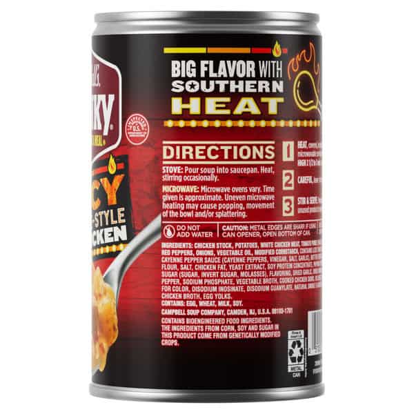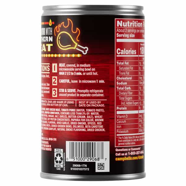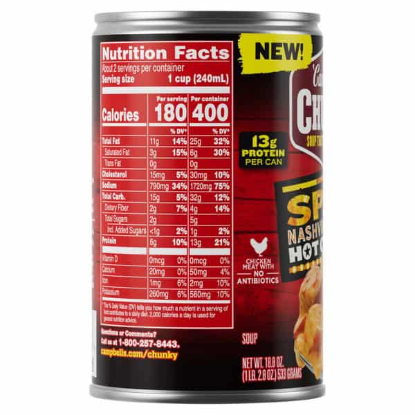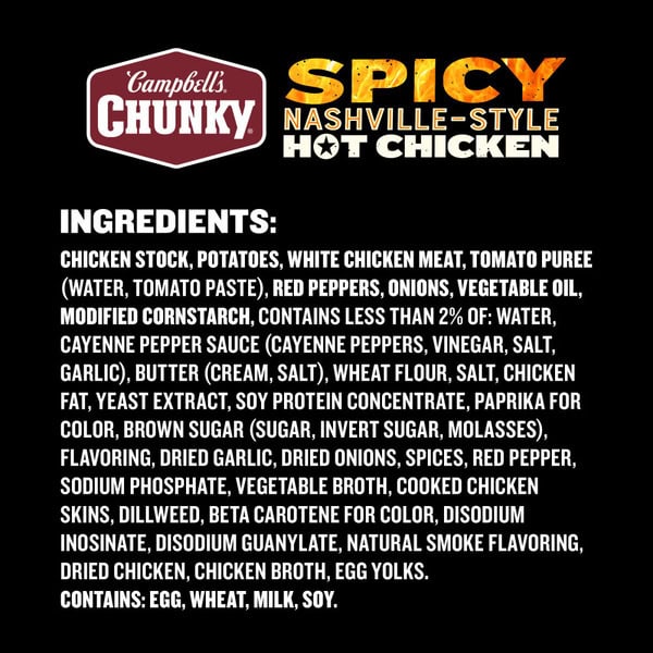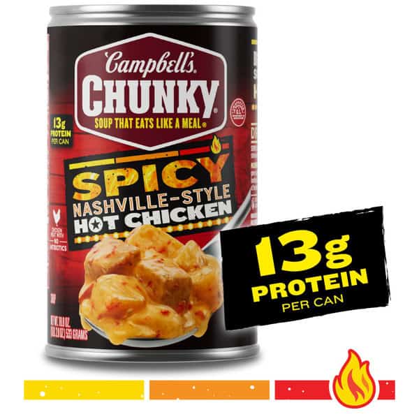 Campbell’s® Chunky® Spicy Nashville-Style Hot Chicken Soup isn’t just tasty—it’s made to spice up your life. With mouth-watering, big flavors with Southern heat and bold ingredients, this spicy soup is capable of fueling even the heartiest appetite. Seasoned with delicious spices and cayenne pepper sauce, this ready-to-eat soup is bursting with sizzling flavor from chicken meat with no antibiotics, red peppers, potatoes and onions. Each can has 13 grams of protein. It Fills You Up Right®. Just pop this easy to microwave soup in a microwave-safe bowl, heat and enjoy. Or, warm it over the campfire on your outdoor adventures. Whether you’re looking for quick and easy microwave soups for home or something to take on the go, Campbell’s® has you covered. The chicken soup can is recyclable for easy disposal. Take on the great outdoors with Campbell’s® Chunky® Spicy Nashville-Style Hot Chicken Soup—Soup That Eats Like a Meal®.