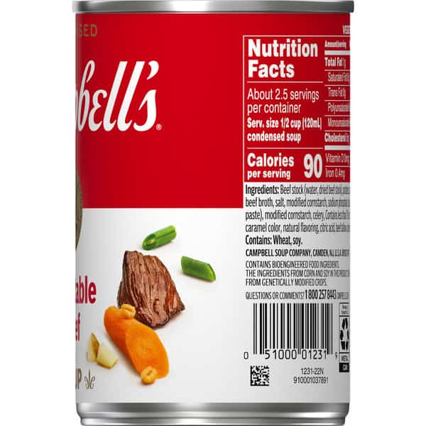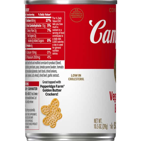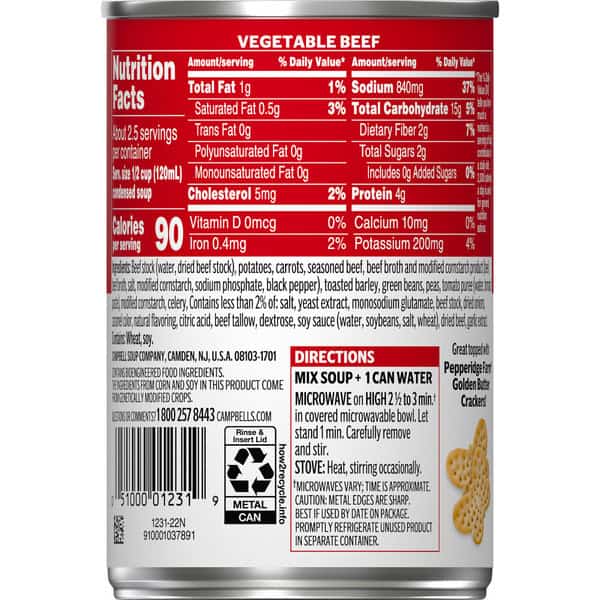 Cozy up with a steamy bowl of Campbell’s® Condensed Vegetable Beef Soup. A family favorite for generations, this wholesome beef vegetable soup is crafted with seasoned beef, carrots, potatoes, green beans and toasted barley in a savory beef stock. The result is a beef veggie soup that brings a smile with every spoonful. Top it with Pepperidge Farm® Golden Butter Crackers, season it with fresh herbs, or pair it with a sandwich or salad for something quick and easy. This convenient canned soup is a year-round pantry staple and the perfect comfort food on a chilly day or when you’re feeling under the weather. Simply mix the condensed soup with 1 can of water and microwave on high for 2.5 to 3 minutes in a covered microwave-safe bowl, or heat in a pot on the stove, stirring occasionally. Each 10.5 oz recyclable can contains about 2.5 servings of microwave soup and features a non-BPA lining. From Vegetable Beef to Cream of Mushroom and everything in between, Campbell’s® makes delicious soups in flavors your family knows and loves, with quality, farm-grown ingredients in every can. M’m! M’m! Good!®